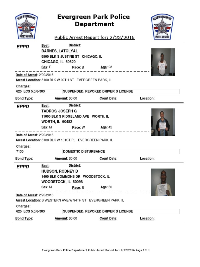 Evergreen Park Arrests, Feb. 12Feb. 20 2016 PDF Driving Road Safety